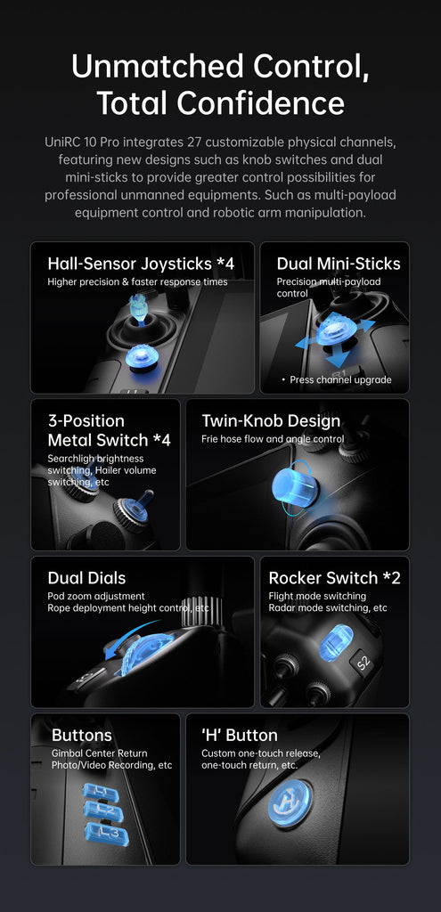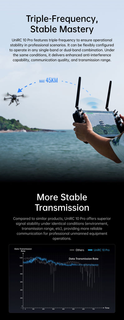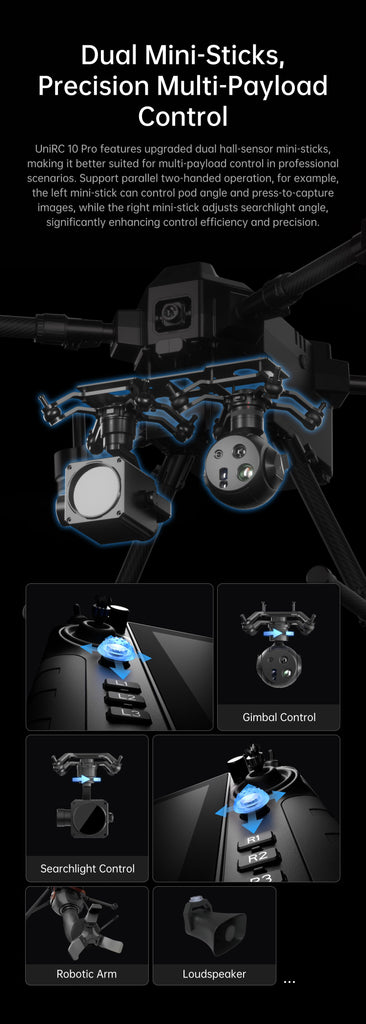 Professional UAV Command System with Extended Digital Link The Siyi UniRC-10 Pro offers a powerful long-range communication platform designed for advanced unmanned operations. As part of the wider ground control stations RC ecosystem, this professional remote unit integrates smoothly with modern autopilot systems, digital video transmitters, and telemetry modules. UAV engineering teams often consider controller compatibility early in the deployment workflow, and the UniRC-10 Pro supports both enterprise-scale projects and R&D-driven environments. By enabling reliable long-distance links, the UniRC-10 Pro contributes to operational safety across multirotor, fixed-wing, and hybrid platforms. Dual-band Architecture for Mission-Critical Performance Extended Telemetry and Reduced Interference The UniRC-10 Pro utilizes a robust dual-band system operating at 2.4GHz and 5GHz, giving UAV operators improved signal reliability in areas where interference is common. This dual-frequency redundancy strengthens BVLOS performance and reduces command latency during long-range missions. MotioNew engineers highlight how dual-band configurations offer significant advantages for field missions that depend on uninterrupted operator-to-aircraft communication. Unified Video and Data Link The controller integrates effectively SIYI digital transmission modules internally, enabling video, control packets, and telemetry to pass over a unified digital interface. This is valuable for tasks requiring real-time imaging such as industrial inspection, surveillance, and mapping. The result is a streamlined workflow where pilots have immediate visual feedback paired with essential system data. Ergonomics Designed for Professional Operation Precision Stick Control The UniRC-10 Pro is crafted for pilots who require precise stick sensitivity and smooth input resolution. Adjustable gimbals help operators maintain consistent control across extended missions, and the layout ensures quick access to programmable switches without overwhelming the pilot. MotioNew integration specialists note that an ergonomic control structure helps reduce fatigue and improves reaction time, particularly during complex mission segments. Built for Harsh Environments Constructed with durable materials and a reinforced housing, the controller is suitable for varying environmental conditions. Operators in high-temperature regions, coastal areas, or remote terrains benefit from the UniRC-10 Pro’s stability and field-ready endurance. Its compact footprint also makes it easy to transport, enhancing workflow efficiency for mobile UAV teams. Platform Compatibility Across Airframe Types Multirotor and Hybrid Airframes The UniRC-10 Pro pairs effectively with systems found in the Multirotor Drone category. Its stable signal architecture provides reliable command input during hover, navigation, and precise maneuvering tasks associated with multirotor missions. VTOL Integration and Transition Stability VTOL designers and operators benefit from the controller’s ability to maintain steady communication during transition phases. Stable telemetry during ascent and descent is essential for hybrid airframes, supported by the broader vtol drone workflows available through MotioNew. Gimbal Payload Operation For missions involving inspection or surveillance sensors, operators frequently rely on precise camera movement. The UniRC-10 Pro supports gimbal control workflows and connects seamlessly with platforms under the Gimbal drone category. This ensures dynamic, stable imaging and smooth payload manipulation. Advantages for Enterprise Buyers Reliable Long-range Command The UniRC-10 Pro is designed for enterprise UAV operators that require dependable long-distance telemetry. Its dual-band system reduces dropouts and provides consistent command input even in RF-challenging environments. Training Efficiency Its intuitive interface reduces onboarding time for new pilots. Procurement teams managing multi-unit deployments appreciate the simplified learning curve while maintaining professional-grade capabilities. Flexible Integration Support MotioNew engineers provide hands-on integration assistance, ensuring proper pairing of the controller with autopilot systems, digital transmitters, and gimbal payloads. This minimizes setup delays and ensures maximum reliability during field operations. MotioNew Integration and Technical Services MotioNew delivers comprehensive technical support for organizations adopting the UniRC-10 Pro. From configuring dual-band telemetry to ensuring optimized remote-to-aircraft synchronization, the engineering team provides tailored guidance that aligns with each project’s mission requirements. This service-oriented approach reduces deployment uncertainty and supports long-term operational consistency. Package contains: 1 x UniRC 10 Pro Ground Unit 1 x UniRC 10 Pro Air Unit
